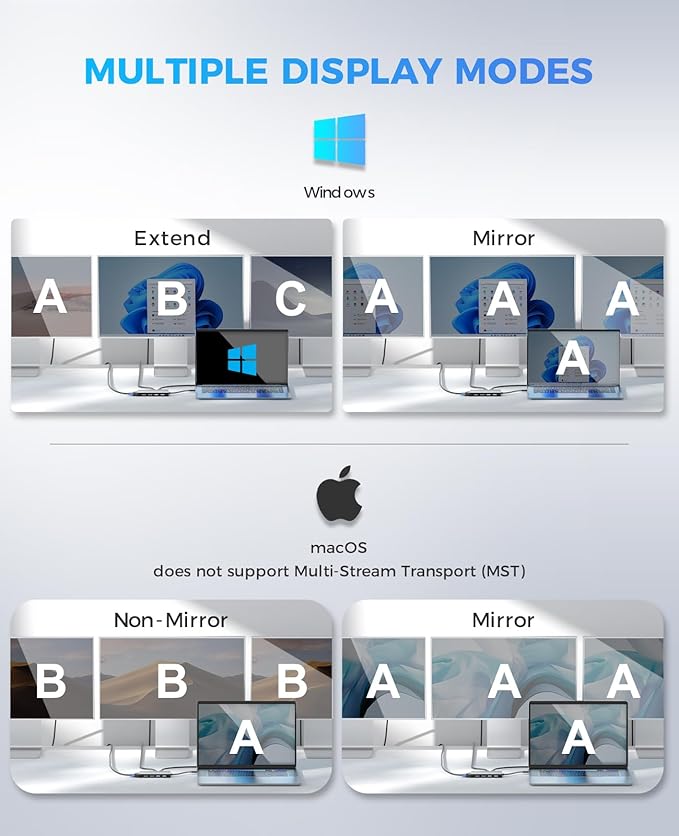 - 【Triple Monitors Display Flexibility】UtechSmart conquers this technical hurdle to create the first USB C docking station with triple display capability on the market. the UtechSmart docking station supports single and dual HDMI monitors up to 3840x2160@30Hz or triple monitors up to 1920x1080@60Hz. Three monitors modes Boost your efficiency 3 times. Note: It does not support extend mode for macOS.