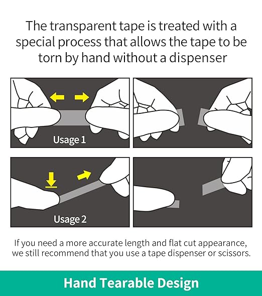 - HAND TEARABLE: Easy to tear by hand design, the tape rolls can be tear off by hand without dispenser. If you need a more accurate length and flat cut appearance, we still recommend that you use a tape dispenser or scissors.
