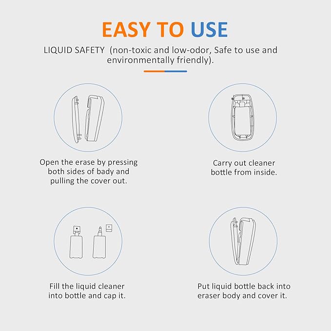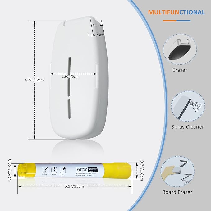 - 【2-IN-1 SPRAY ERASER】- Both wet and dry wipe are available. Combines dry eraser and empty spray cleaner bottle in one, Opens easily for refilling with dry erase cleaning solution, clean surfaces more efficiently and is time-saving. The felt material smoothly picks up ink and dust. Quickly and cleanly erase without leaving dust or stains