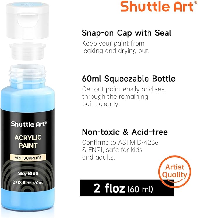 Shuttle Art Acrylic Paint, 42 Colors Acrylic Paint Set with 12 Brushes, 2oz/60ml Bottles, Rich Pigmented, Water Proof, Premium Paints for Artists, Beginners and Kids on Canvas Rocks Wood Ceramic
