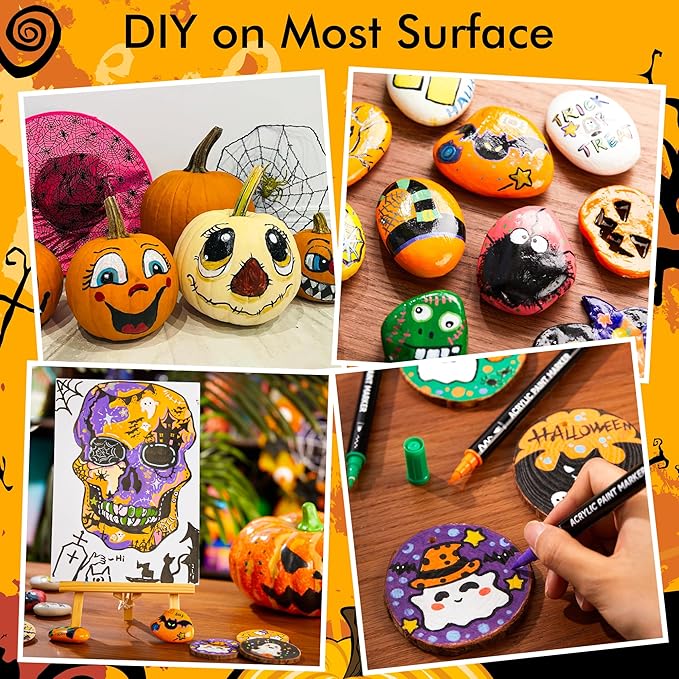 - 【MULTI-PURPOSE】: Enjoy creating art projects on a variety of surfaces, acrylic paint marker set suitable for rock painting, ceramic and mug painting, glass and wine glass painting, wood, fabric, stone, metal, plastic, canvas, Christmas ornament, Halloween pumpkin painting, scrapbook, bullet journal, custom mugs, DIY crafts projects, and much more for both smooth and porous surfaces.