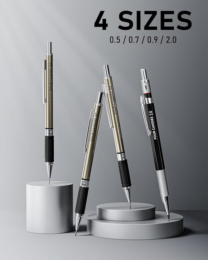 Four Candies 25PCS Art Mechanical Pencil Set with Case, 3PCS Metal Artist Lead Pencil 0.5, 0.7, 0.9 mm & 3PCS 2mm Holder (HB 2H 2B 4B Color) with 432PCS Graphite Lead Refills for Drawing Sketching