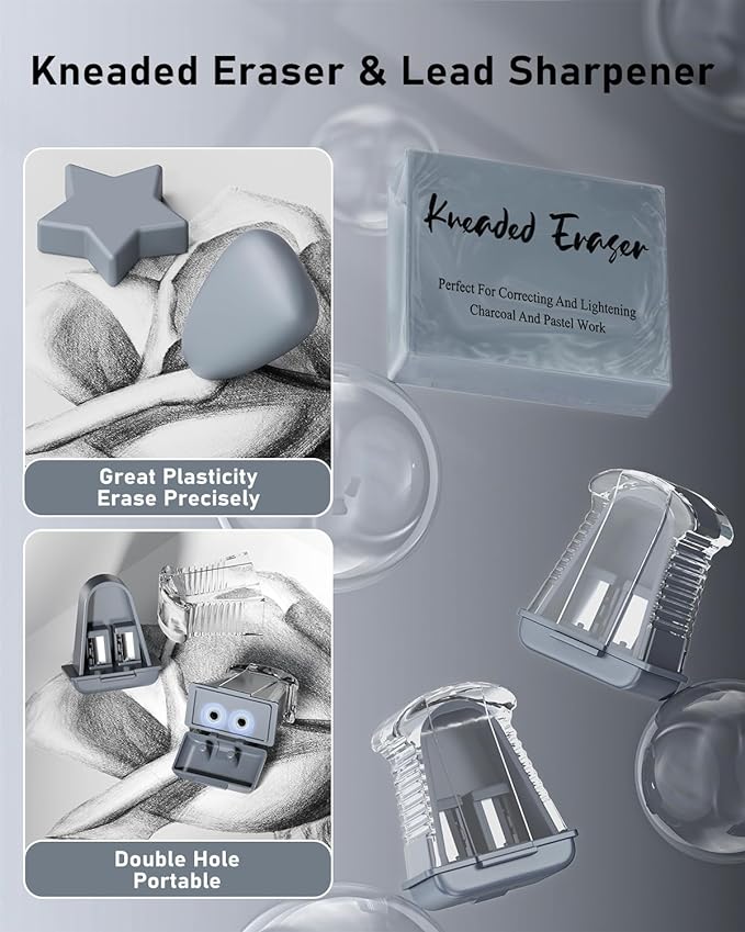 - 【Kneaded Eraser&Sharpener】Includes a kneaded eraser and a sharpener built into the cap of a 2.0mm lead holder, Two extra lead sharpeners are provided for 2.0mm leads to keep them fine when they become dull. The kneaded eraser is ideal for cleaning and blending charcoal, pencils in drawings.