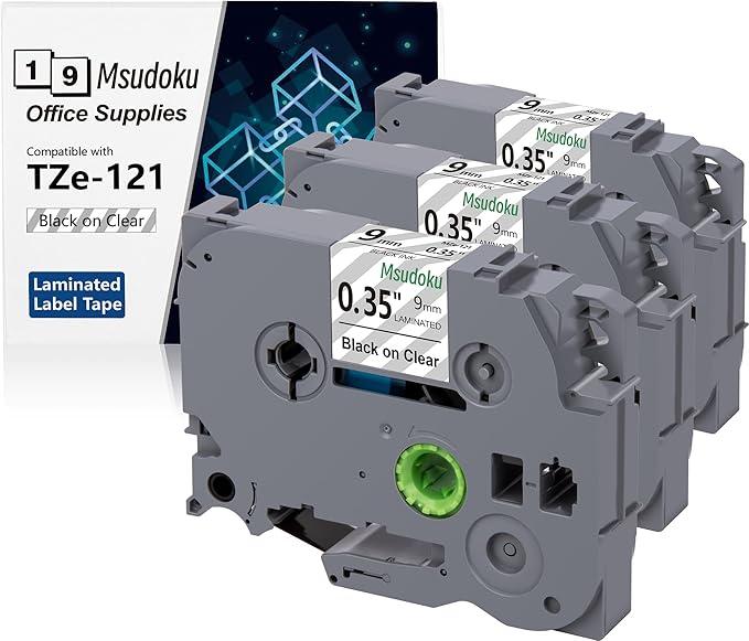- These compatible for brother label maker tape 9mm 0.35 TZe-121 TZe121 have strong adhesive and no sticky residue when you remove it. The split back design of ptouch label tape 9mm clear label tape is very easy to peel off