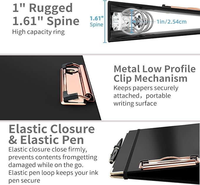 - 【Clipboard & Elastic Closure Design】Booklet-size clipboard with durable cardboard base provides a hard, portable writing surface;Low-profile clip can hold up to 100 sheets paper. In addition, the binder's elastic closure not only can close the binder firmly, but also acts as a bookmark.
