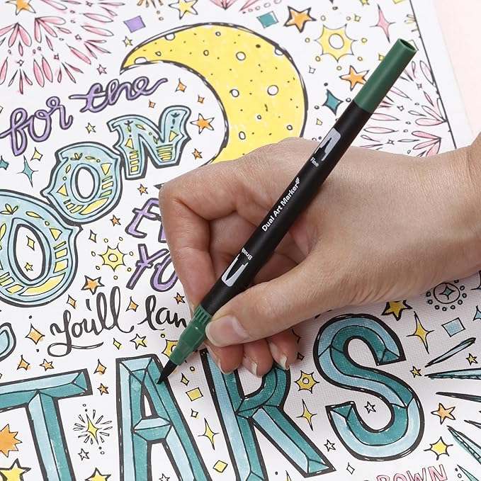 - DUAL TIP CALLIGRAPHY PENS – Each pen includes a brush tip for bold strokes and a fine tip for precision lines - perfect calligraphy pens for writing, outlining, coloring, and journaling.