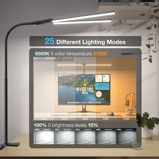 LED Desk Lamp for Home Office, Bright Double Head Desk Lamp with Clamp, Dimmable 5 Color Modes Desk Lighting, 12W Eye-Caring Architect Table Lamp for Workbench, Monitor, Reading, Study, 1400lm