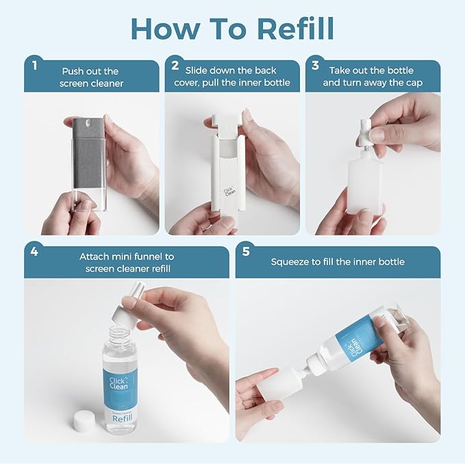 - ALL-IN-ONE MULTIFUNCTIONAL CLEANER KIT- In addition to the 4 screen cleaners included, you get one 4oz bottle of refill, 1 microfiber cloth, 1 mini funnel (built-in), and a sprayer. The refill extends the product's life; the mini funnel helps you refill the cleaner; the sprayer mounts to the refill spout, and the fibre cloth is a new product.
