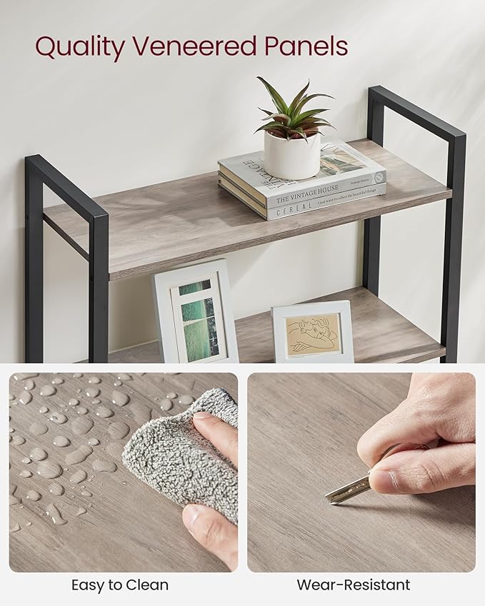 - Embrace an Industrial Vibe: The heather greige shelves paired with a black steel frame create a stylish industrial look, allowing this freestanding shelf to fit seamlessly in with your home decor and give your space an instant update