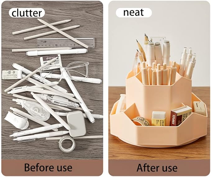 - -ROTATING DESKTOP ORGANIZER - Simply spin this pencil holder to store or take out your things, this storage organizer allows you to keep all of your things within reach. Our office plastic desk organizer with divided 9 compartments that will organize pens, pencils, , ruler, clips, scissors and other office accessories separately.