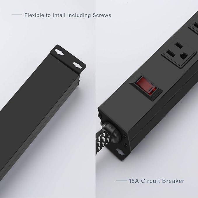 - 【Extra Protection】Equipped with a 15 amp circuit breaker power switch and a built-in 1200J surge protector MOV module, this long power strip provides comprehensive protection for your valuable appliances. Its impact-resistant aluminum body ensures long-term reliable performance. Say goodbye to worries about overload and voltage spikes.