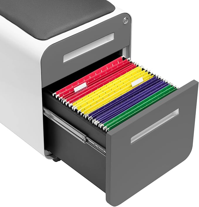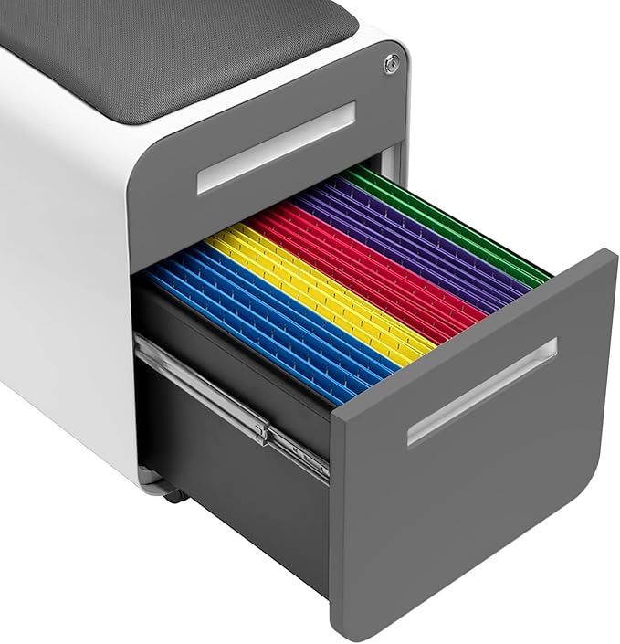 Laura Davidson Furniture STOCKPILE Mini Seated 2 Drawer Mobile File Cabinet with Removable Magnetic Cushion Seat - Short Version, Metal Filing Cabinet, Pre-Assembled, Dark Grey Face with Grey Cushion