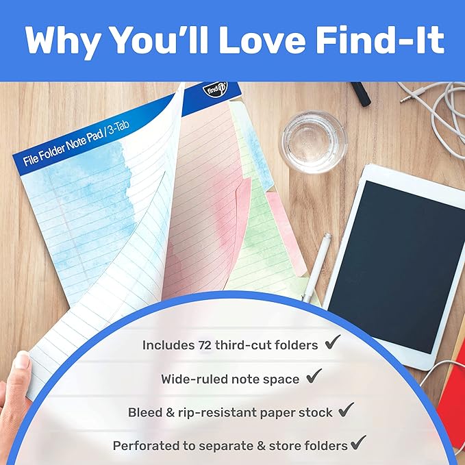 - 72 FOLDERS - Enjoy 72 watercolor third-cut file cabinet folders in each pad. The perforated top allows you to simply tear and file your notes easily and efficiently.