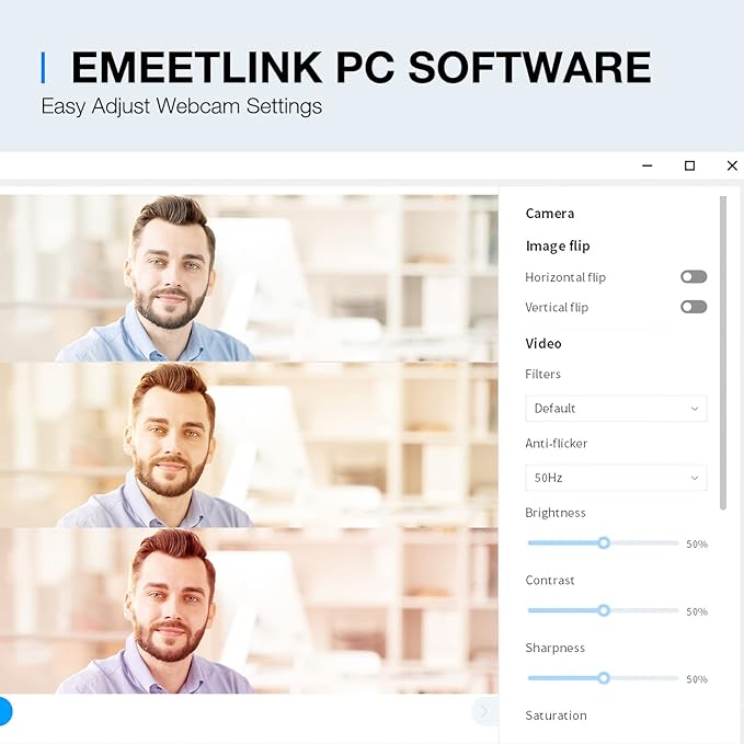 - [Personalized Settings with EMEETLINK] Customize your image settings with the EMEETLINK PC software, adjusting brightness, contrast, sharpness, saturation, and white balance for your ideal video. Upgrade firmware for peak performance and adjust power line frequency (50Hz/60Hz) for global travelers and remote workers.