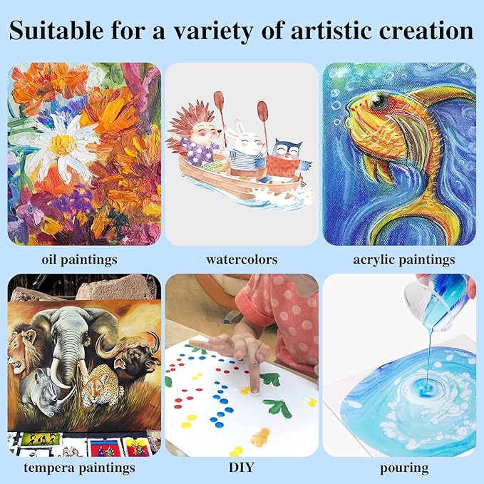 - Pure Cotton Canvases:Compared with ordinary paint canvas,cotton canvases are easier to color,so that your painting stays bright,not easy to break,art canvases for painting suitable for oil painting,watercolors,acrylic paintings,tempera paintings,pouring,Gouache and Tempera,etc.