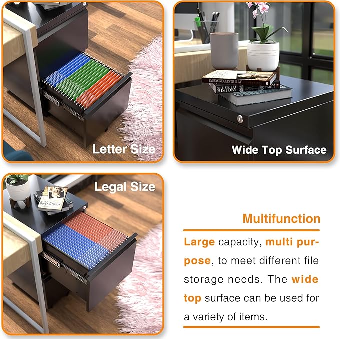 - 【INTERLOCK SYSTEM】Filing cabinet use one lock with 2 keys secures all 2 drawers,the two drawers offer big storage space and each one is offered with a removable hanging file bar that accommodates letter, legal and A4 size documents. Guaranteed to keep your files organized.