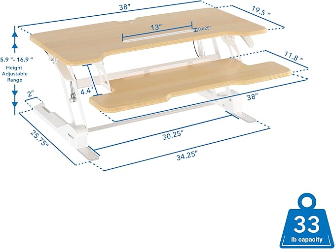 - Wide, Comfortable Keyboard Tray: The keyboard tray measures 38" x 11.8", providing ample space for a full-sized keyboard and mouse pad. This layout promotes an ergonomic typing position, which is essential for comfort and productivity during long work hours, making it an ideal standing desk topper for any professional environment.
