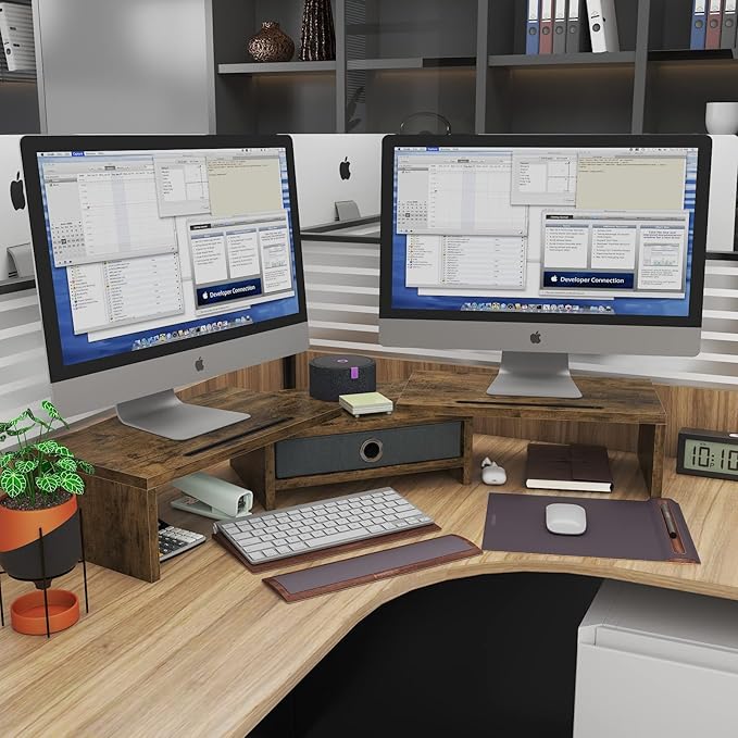WESTREE Dual Monitor Stand Riser with Drawer, 3 Shelf Computer Monitor Riser with Adjustable Length and Angle, Desktop Monitor Stand Riser Storage Organizer for 2 Monitors