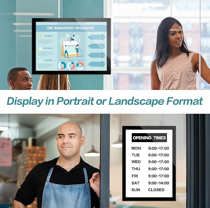 - ✔【Flexible Application in Various Scenarios】Acrylic magnetic sign holder can be displayed vertically or horizontally and reused. It is an excellent advertising tool for offices, factories, homes, shops, restaurants, hotels, banks, exhibitions, schools, hospitals, corridors, elevator entrances and other places to display certificates, document notices, flow charts, reminder signs, drawings, photos, price lists, business hours, precautions, posters.