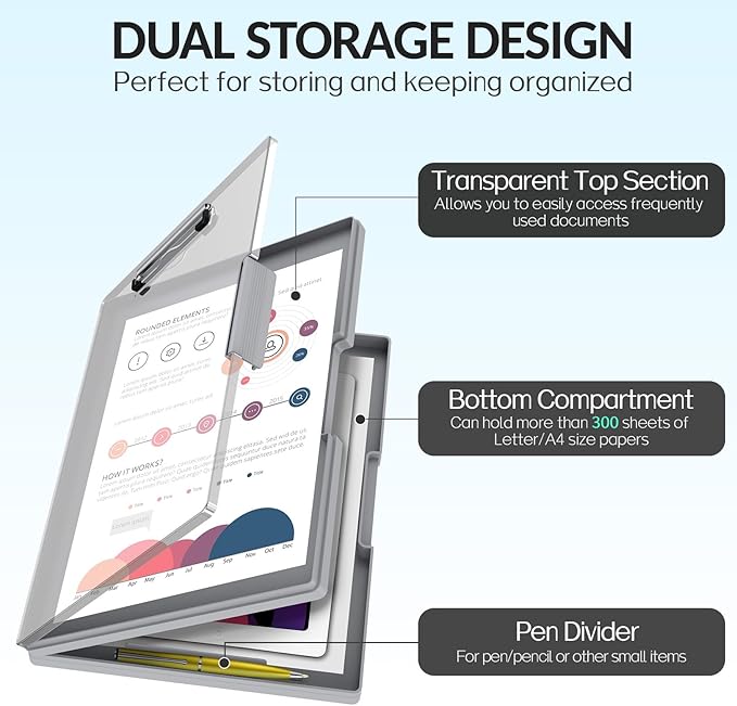 Sooez Clipboard with Storage, Heavy Duty Cleaview Clip Boards 8.5x11 with Dual Storage, Dry Erase Plastic Nursing Clipboard, High Capacity Clipboards Folder for Teacher Nurse, School & Office Supplies