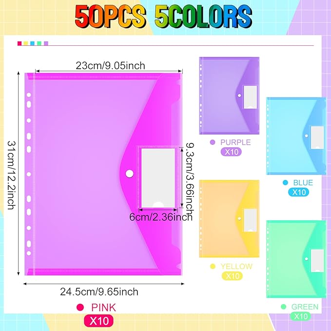- Enough for Daily Use: you can receive 50 pieces of binder dividers with pockets; There are 5 colors, including green, pink, yellow, blue and purple; Each size is about 12.2 x 9.65 inches/ 31 x 24.5 cm, which can accommodate documents of standard letter size; 11 Holes, suitable for 2/3/4 ring binders