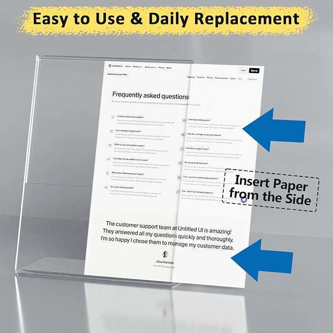 - 【 Slanted Back & Stable Standing】The acrylic paper holder is designed with a tilting design and a very stable base that makes it easy to stand steadily on any indoor and outdoor desktop. Clear slanted back vertical sign holders are perfect for displaying 8 1/2-inch x 11-inch Standard letter-size signs, photos, posters, or menus.