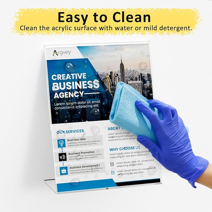 - 【Versatile Uses Meet All Your Needs】Argvey 8.5 x 11 plastic slant back sign holder can be used in various settings such as businesses, offices, restaurants, retail stores, lobbies, homes, wedding scenes, trade exhibitions, and more. Showcase your brand logos, advertisements, menus, flyers, brochures, price tags, art photos, and other promotional flyers with ease.