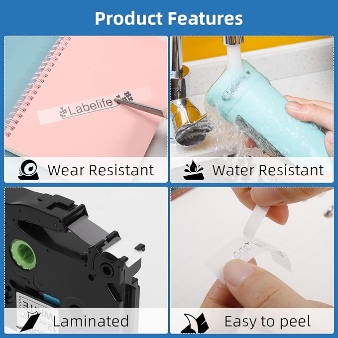 - Durability labels: Compatible with Brother p touch label maker 9mm clear tapes are laminated tape. It has features of withstand water/ oil/ abrasion/ temperature/ fade resistant, etc. Strong adhesive but zero sticky residue when removed. Split backing for easy peeling