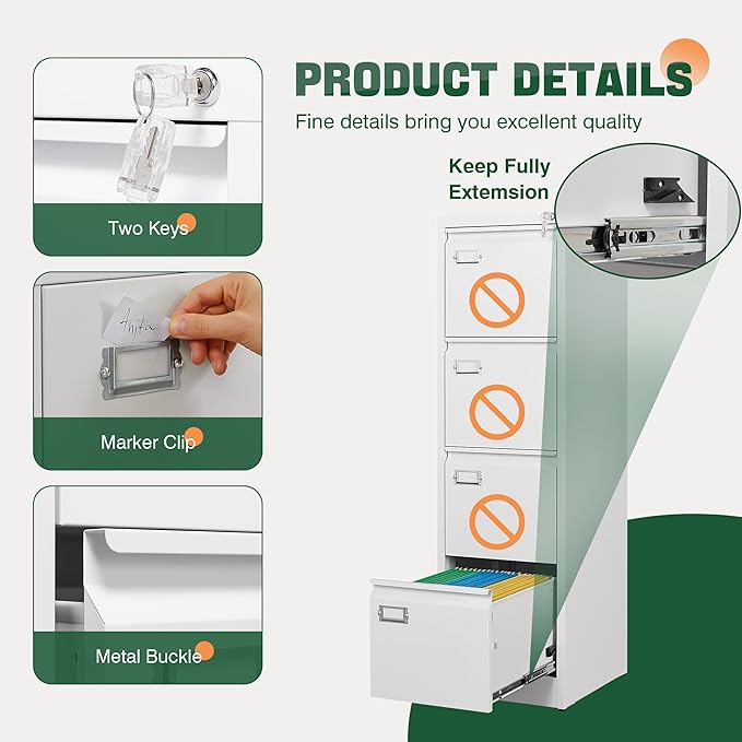 Letaya 4 Drawer File Cabinet with Lock,Metal Office Filing Cabinets for Home Office- Storage A4/F4/Letter/Legal -Assembly Required (White)