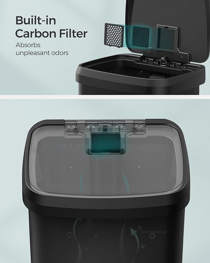 - [Thoughtful Detailing] The carbon filter in the lid helps absorb unpleasant odors, keeping your kitchen smelling fresh. Included are 15 liner bags (16-18 gallons) that perfectly fit this kitchen can