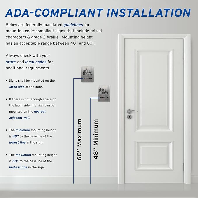 - âś… ADA COMPLAINT & BRAILLE SIGN: Our restroom signs for business are compliant with national ADA and braille reading standards. Where permanent commercial signs are required, a sign should be installed on the wall adjacent to the door handle or latch side of the door. These ADA bathroom signs should be hung 48 to 60 inches between the finish of the floor and the bottom of the last line of copy on the sign.