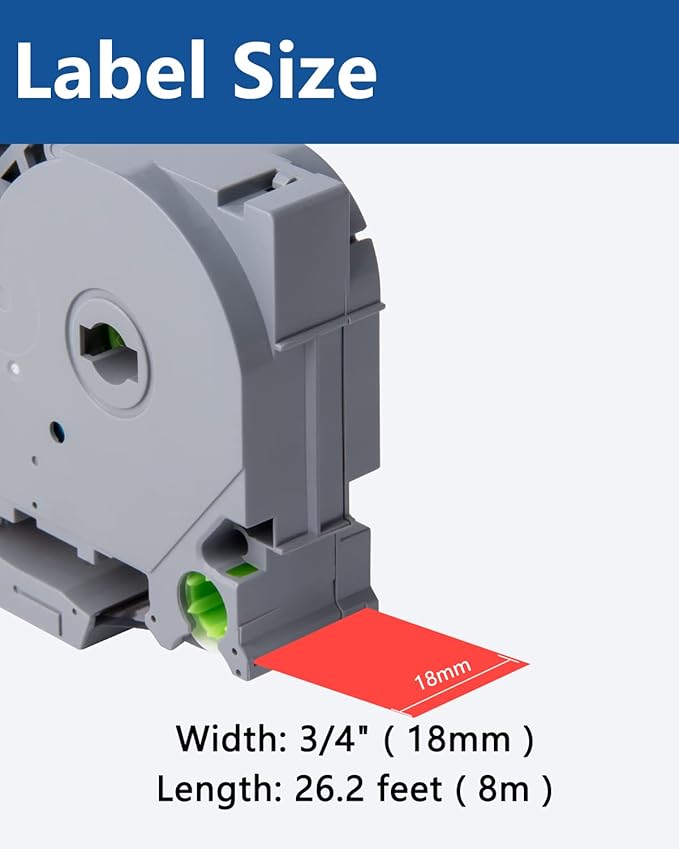 - Size - 3/4" width x 26.2' length ( 18mm x 8m ) each 18mm label maker tape. Color - Black ink on red tape