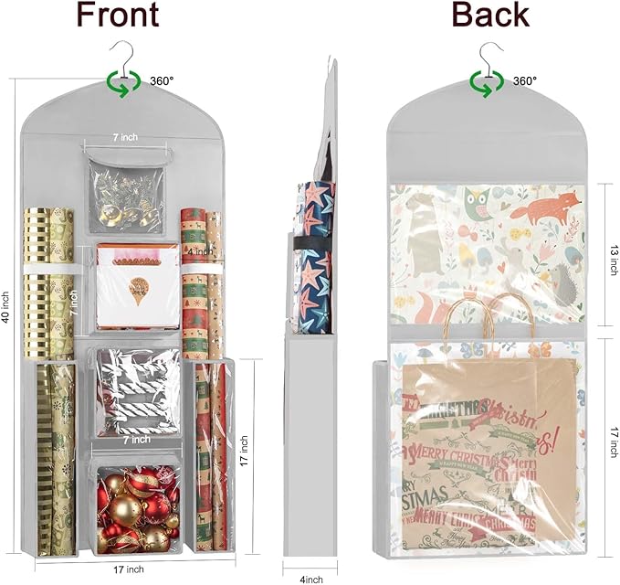 - Upgraded Capacity: Many storage bags are often designed too small and can not accommodate items, so we have increased the capacity to help you store more items. Our extra large gift wrapping container is 40 inches in length, you can store up to 6 paper tubes on each side, and the four bags on the front are about 9*10.2 inches, it can store larger wrapping materials to avoid not fitting.On the back side have two large bags