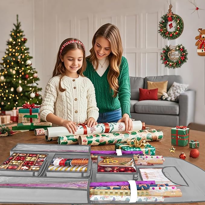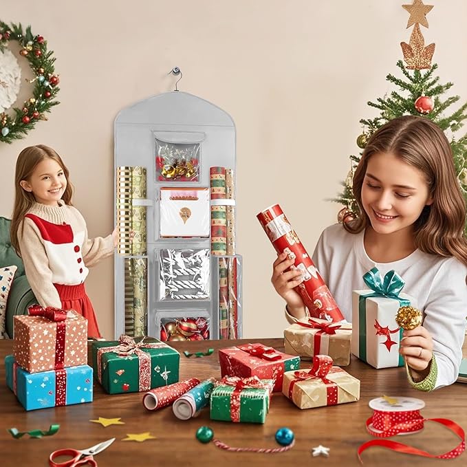 - ALL-IN-ONE ORGANIZER: The front side of these wrapping stations has 2 compartments for rolls of 40-inch gift wrap or craft wallpaper, keeping your unused Christmas, birthday, or wedding gift wrap neat. 4 square bins and pockets for ribbon, small Christmas decorations, an envelope bag, bow, cards, tags, tape, scissors, tissue paper, and everything else. Their backsides each have 2 large pouches for keeping gift bags or flat gift wraps