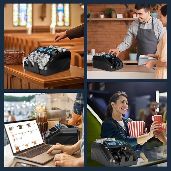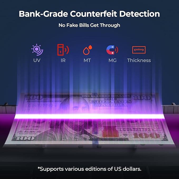 - [Precise Detection] This currency counter uses UV/IR/MG/MT detecting technology to examine the bills using Magnetic, Infrared, Ultraviolet, Dimensional, Thickness, Security Line, Variable Ink, Spectrum, and Fluorescence Detection techniques to completely protect your company from false bills.