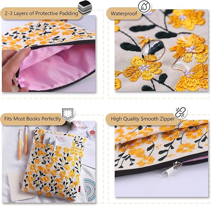 LParkin Embroidered Daisy Flower Book Sleeve with Zipper - Washable Fabric Book Cover Protector for Paperbacks & Hardcover, Gift for Book Lovers (Yellow, 11x8.5 Inch)