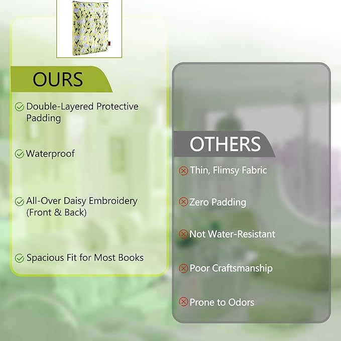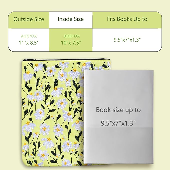 LParkin Daisy Flower Embroidery Book Sleeve with Zipper for Readers Protector Cover Gift for Book Lovers, 11x 8.5 Inch Washable Fabric, Daisy White(White)