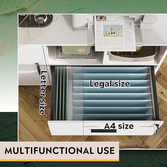 - All-purpose storage: The wide filing cabinet with shelf spaces and large storage drawer fulfill different organization needs. The shelves in the side cabinet helps to organize mess in home office, and the spacious top board can store office equipment such as printer and scanner.