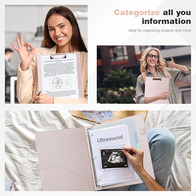 - 【Versatile】1 inch sturdy round ring, can hold 200 sheets of paper securely. The interior features two pockets to store letter-sized documents and important loose papers. Also comes with a divider for 5 tabs and a sheet of stickers (the tabs fit perfectly into the divider) for easy organization. The design of the clipboard is convenient for fixing paper and taking it out for writing at any time.