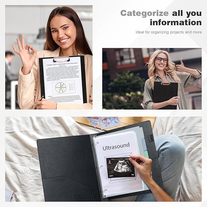 - 【Versatile】1 inch sturdy round ring, can hold 200 sheets of paper securely. The interior features two pockets to store letter-sized documents and important loose papers. Also comes with a divider for 5 tabs and a sheet of stickers (the tabs fit perfectly into the divider) for easy organization. The design of the clipboard is convenient for fixing paper and taking it out for writing at any time.