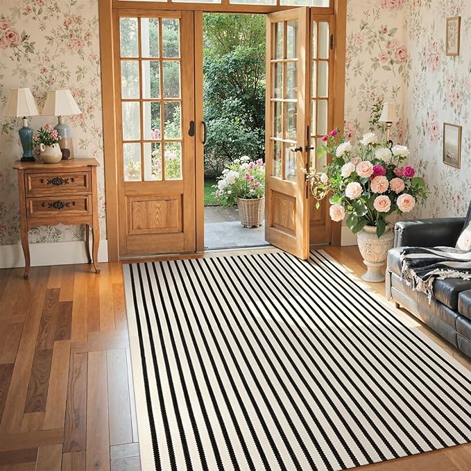- Classic Striped Pattern: Classical black stripe style, spruce up your indoor and outdoor setting, for a modern and welcoming look that ties any space together. Chic and trendy look rug is the way to elevate your farmhouse front door decor.Different woven Pattern color on both side,it will be a great choose,achieves the use of 2 rug reversible use.