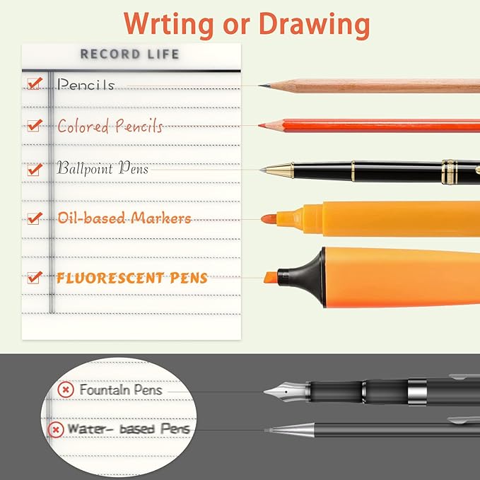 - 【Writing Experience】For a better user experience, please use the categories of pens we recommend: ballpoint pens, pencils, oil-based markers. It is not recommended to write with a water-based pen.