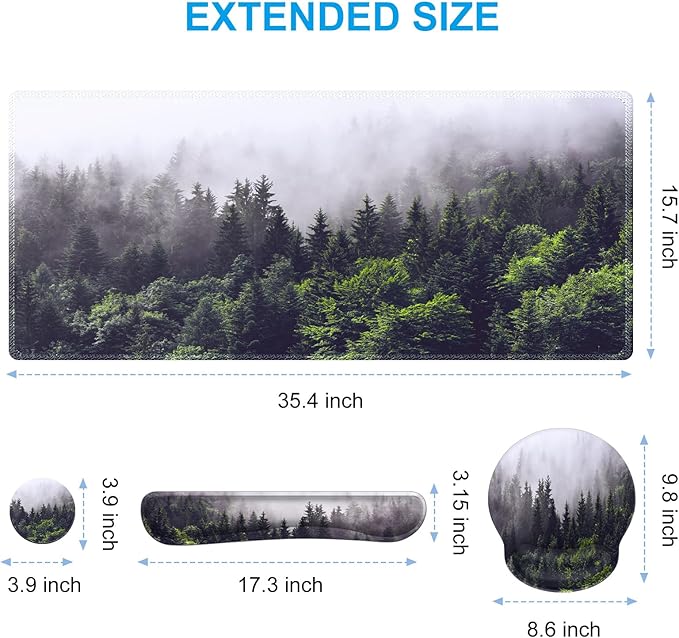 - Large Mouse Pad Size: Extended mouse pad:35.4" x 15.7",wrist rest for computer keyboard:17.32" x 3.15" x 0.98",wrist rest for mouse:8.66" x 9.84" x 0.86",Coaster:3.93" x 3.93"