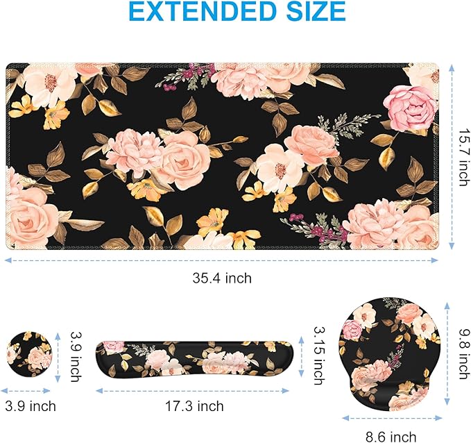 - Large Mouse Pad Size: Extended mouse pad:35.4" x 15.7",wrist rest for computer keyboard:17.32" x 3.15" x 0.98",wrist rest for mouse:8.66" x 9.84" x 0.86",Coaster:3.93" x 3.93"