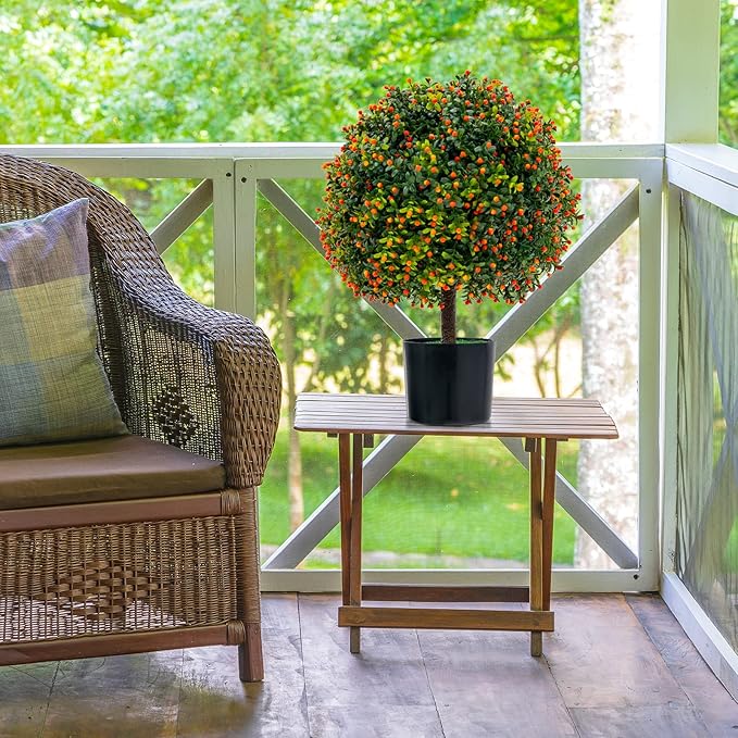 - Realistic & Vivid Design - Designed with orange mini fruits and luxuriant leaves for vitality, the 2 pack artificial boxwood topiary tree will make you feel close to nature. Besides, it comes with simulated trunk and grass to show vitality, also equipped with a solid flower pot filled with cement, which features excellent stability.