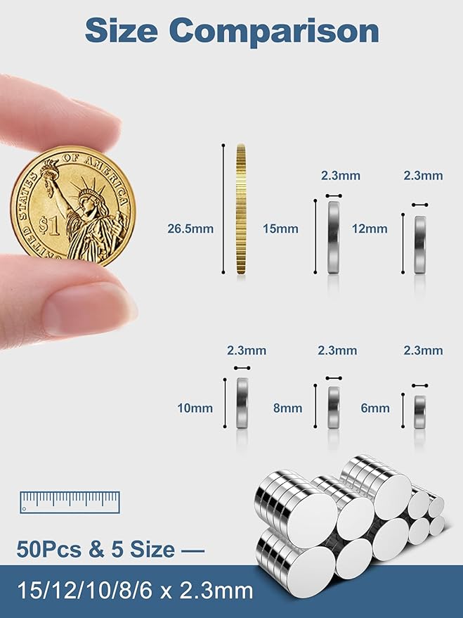 - Useful Design - 50 Pcs & 5 Sizes (Diameter: 15/12/10/8/6 mm, thickness: 2.3 mm), each magnet is able to hold at least 15pcs sticky notes. You don't have to worry it's not able to fixate the paper.