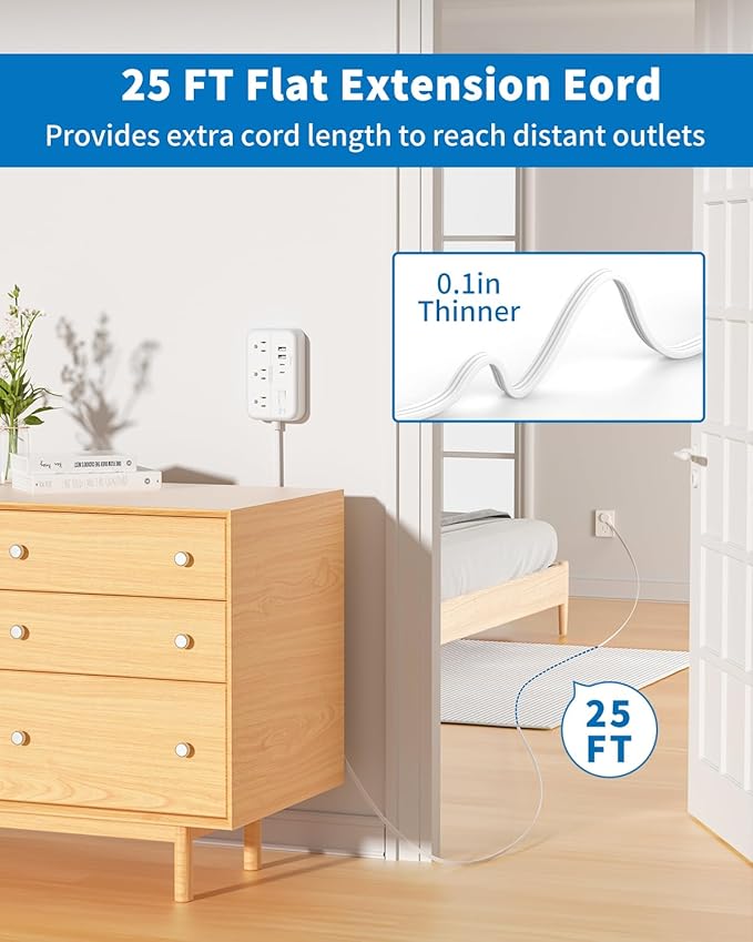 - 【Surge Protection & Overload Protection】- The surge protector with overload protection protects your electrical appliances from lighting, surges, or spikes. The minimum energy-absorbing capacity of 1080 Joules. The flat extension cord with built-in multiple security modules safeguards your electronic devices from overload and over-current/over-charge/short circuit/over-heated.