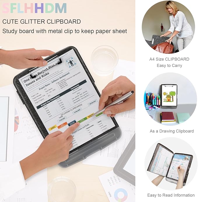 - Glitter Design: Clip boards 8.5x11 with storage have a bright color, Classic and chic glitter elements make this colorful clip boards more attractive. The ergonomic design of the grip is non-slip and comfortable. With this unique clipboard, your daily works are far more fun and easy