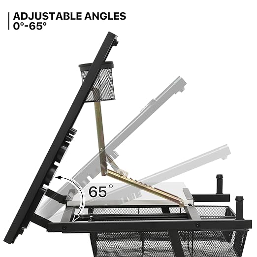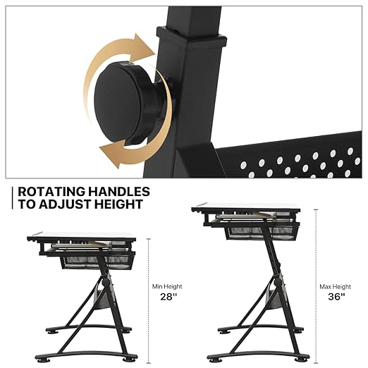 - Height and Angle Adjustable - The height of this artist desk can be adjusted from 28 inches to 36 inches with the knob on the leg. Furthermore, the main tabletop angle can be adjusted from 0 to 65° to meet different creative needs. An adjustable pencil ledge on the bottom of the tabletop also helps hold papers and stationery when the desktop is tilted.