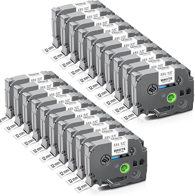 - Package Includes: 20 Pack Label Tapes Compatible for Brother Ptouch Tze-231 label tape, Color: Black on White, Size: 12mm (1/2'') x 8m (26.2feet)